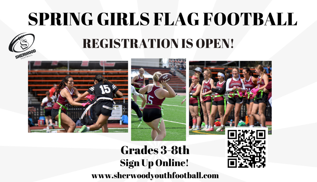 Date: Sunday, Feb 1st from 2-4pm at the SHS football stadium field. Check-in begins at 1:30pm. Ages 8-14. No charge! Girls should have comfortable clothing that can get a little wet/dirty, sneakers or cleats and bring a water bottle. Prepare for the weather, if there is any. We will be doing fun, simple flag football drills, including basic footwork, throwing, catching and pulling flags! * If you have any questions, please email Sarah Cabot at: sarah.cabot@sherwoodyouthfootball.com